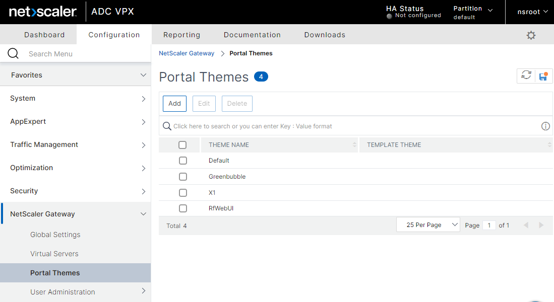 In the NetScaler Gateway administrative interface, navigate to Configuration -> NetScaler Gateway -> Portal Themes and click the Add button.