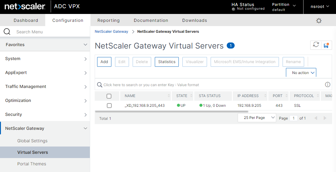 In the NetScaler Gateway administrative interface, navigate to Configuration > NetScaler Gateway > Virtual Servers and click on the Virtual Server.
