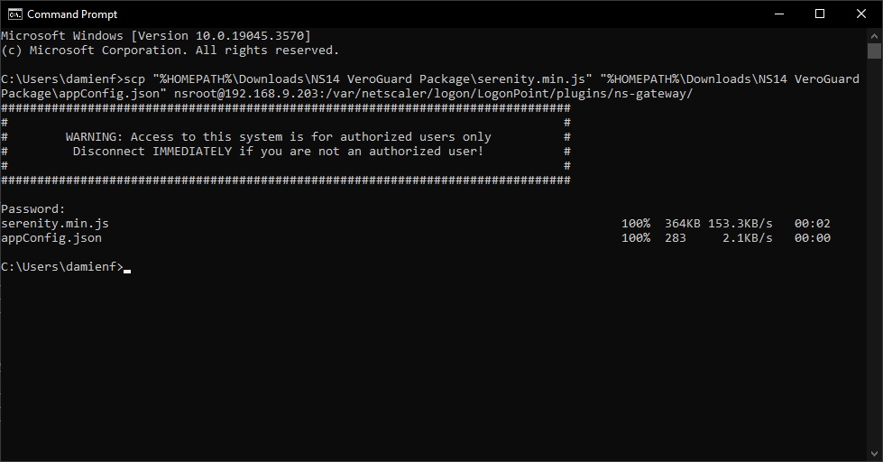 scp "C:\Temp\serenity.min.js" "C:\Temp\appConfig.json" nsroot@192.168.1.254:/var/netscaler/logon/LogonPoint/plugins/ns-gateway/