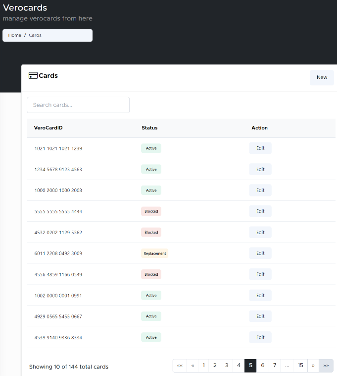 By clicking on the “VeroCards” tab, the view will display an actionable list of VeroCards associated to the organisation and their high-level status.